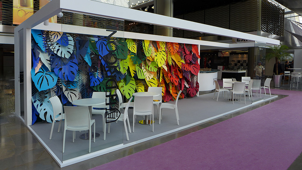 Small but nice! In cooperation with Thomas Manss&Company we designed a booth at the luxepack trade fair in Monaco for Fedrigoni. Luxpack is all about the latest products in packaging. Fedrigoni presents its paper ranges Arconvert, Freelife and Sirio Colour. The stand features a beautiful artwork consisting of colourful jungle leaves made by the designers of Wonderland Studio.
