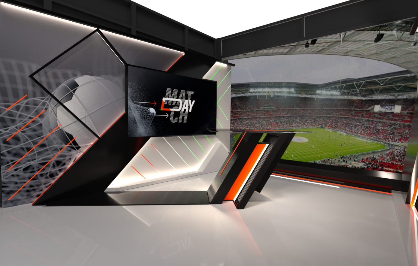 We were asked to design several small studios that could be used for the live coverage of football invents, such as Conference League and Euroleague. Strong, graphical shapes and angular lines reflect the dynamic and power of football competitions.